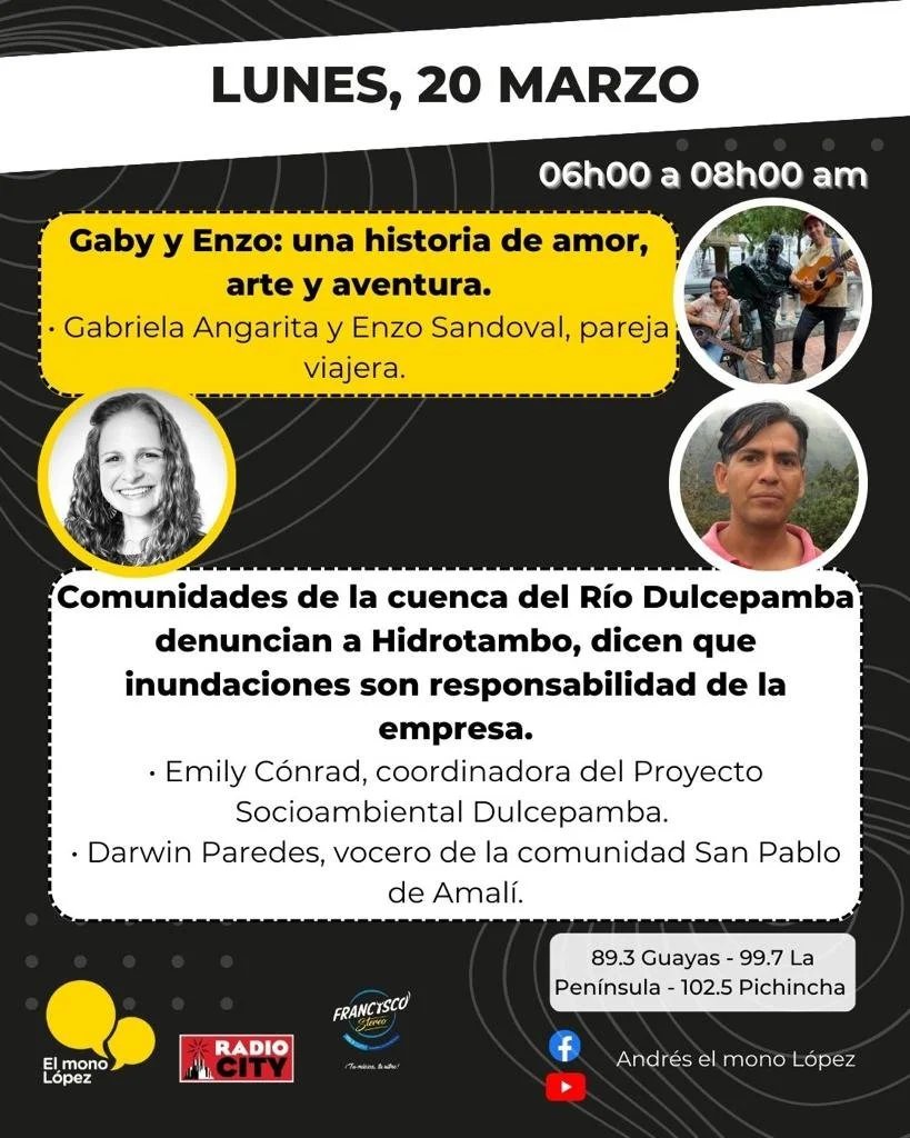 Publicado por El mono Lopez y Radio City01 de junio, 2023— Gabriela Bermeo, Abogada del Proyecto Dulcepamba que litiga a favor de las comunidades de la cuenca del río Dulcepamba conversa sobre la reversión de la autorización de agua de la empresa hidroeléctrica Hidrotambo S.A.